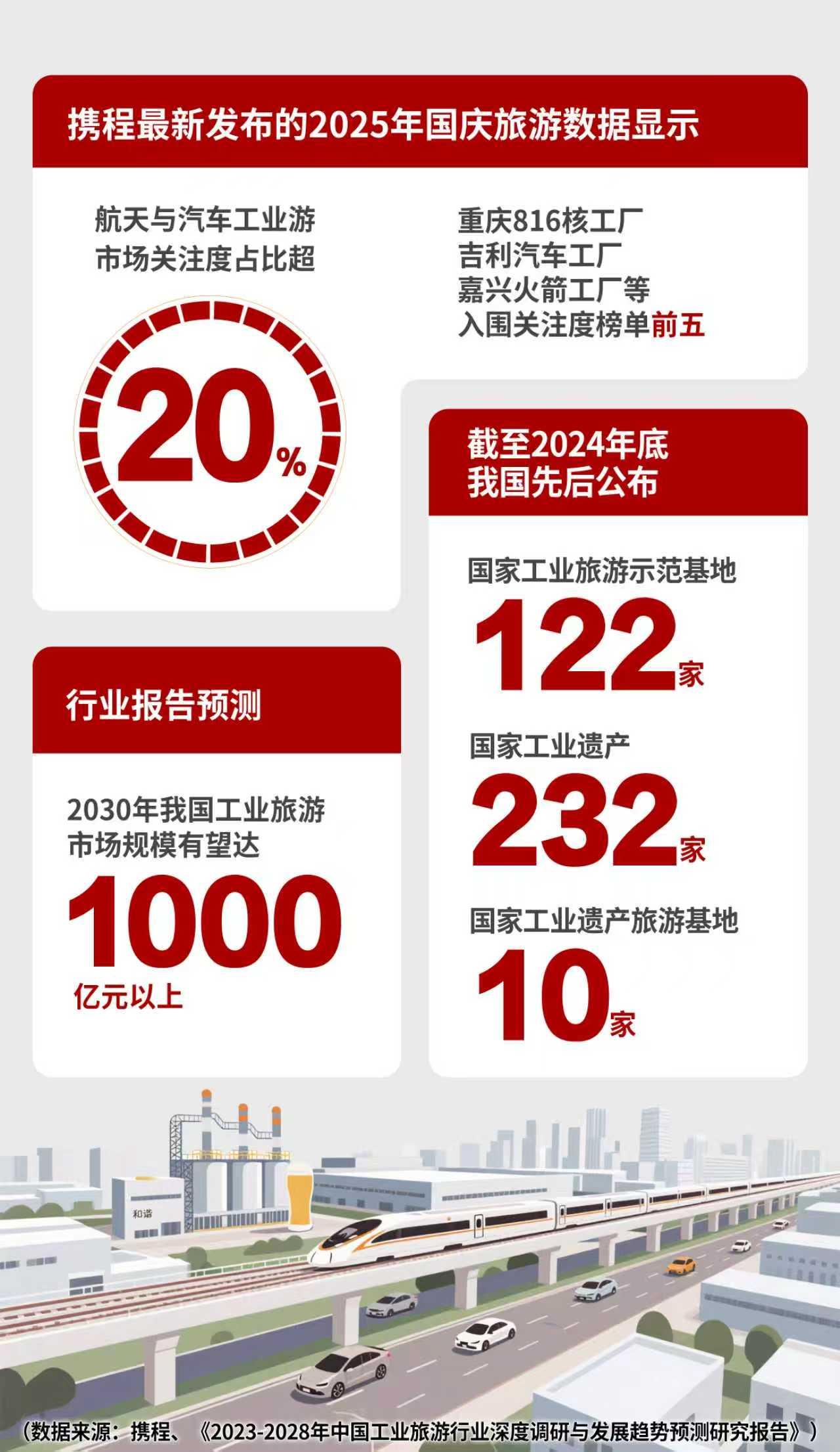 根据携程最新发布的2025年国庆旅游数据,高科技与重工业研学游成为市场黑马。其中,航天与汽车工业游的市场关注度占比超过20%,重庆816核工厂、吉利汽车工厂、嘉兴火箭工厂等入围关注度榜单前五。